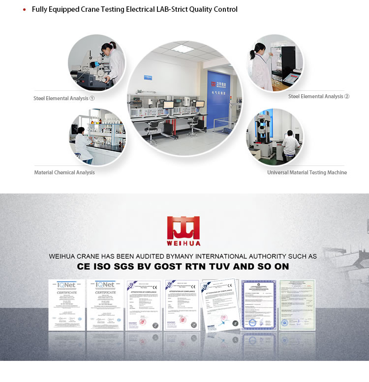 WEIHUA founded China’s first crane design R & D team and there are 500 personnel now, developed the anti-swing technology independently and has obtained more than 100 patents. Weihua has been the post-doctoral scientific research workstation of Henan Province for four consecutive 4 years. Weihua has its own independent laboratory and has passed the CNAS certification, it is the only one industrial crane production and testing base appointed by government.