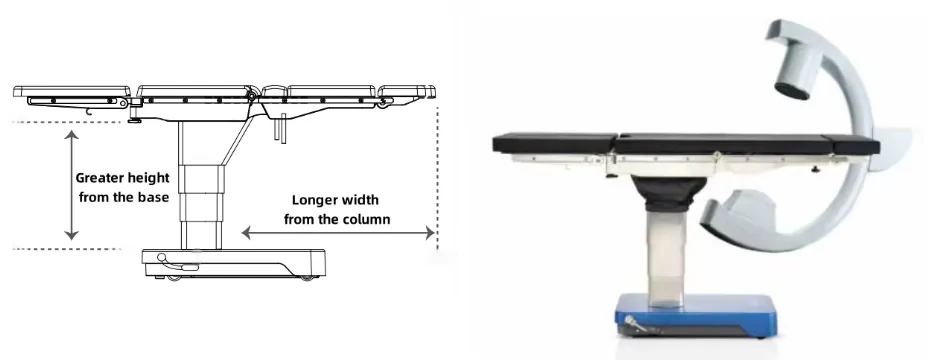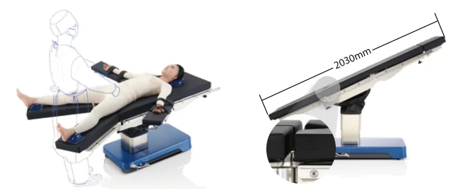 * The sleek bed frame and base design provide ample under-table space for surgeons, facilitating C-arm maneuvers.