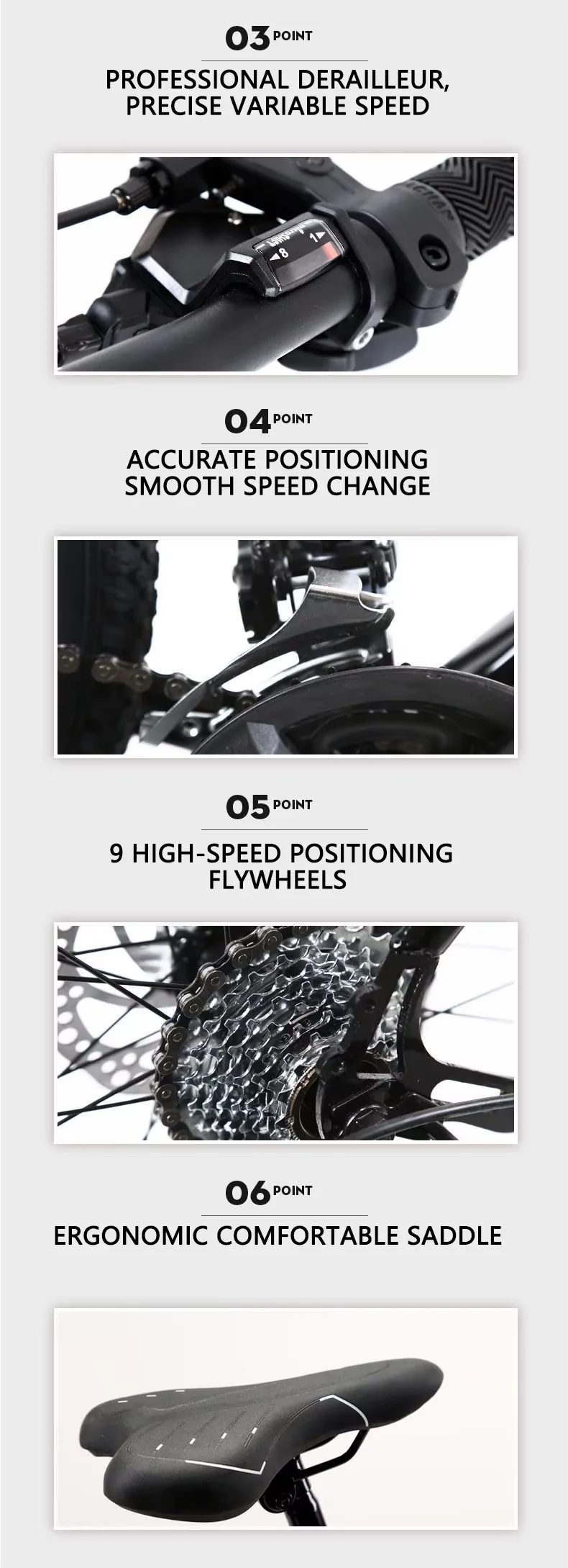 Designed with versatility in mind, this fat tire bike is perfect for snow biking, sand trails, mountain paths, and rough terrain riding. Whether you're cycling through snowy landscapes or sandy beaches, the bike’s robust construction and fat tires ensure a smooth and safe ride, providing you with unmatched performance no matter the terrain.