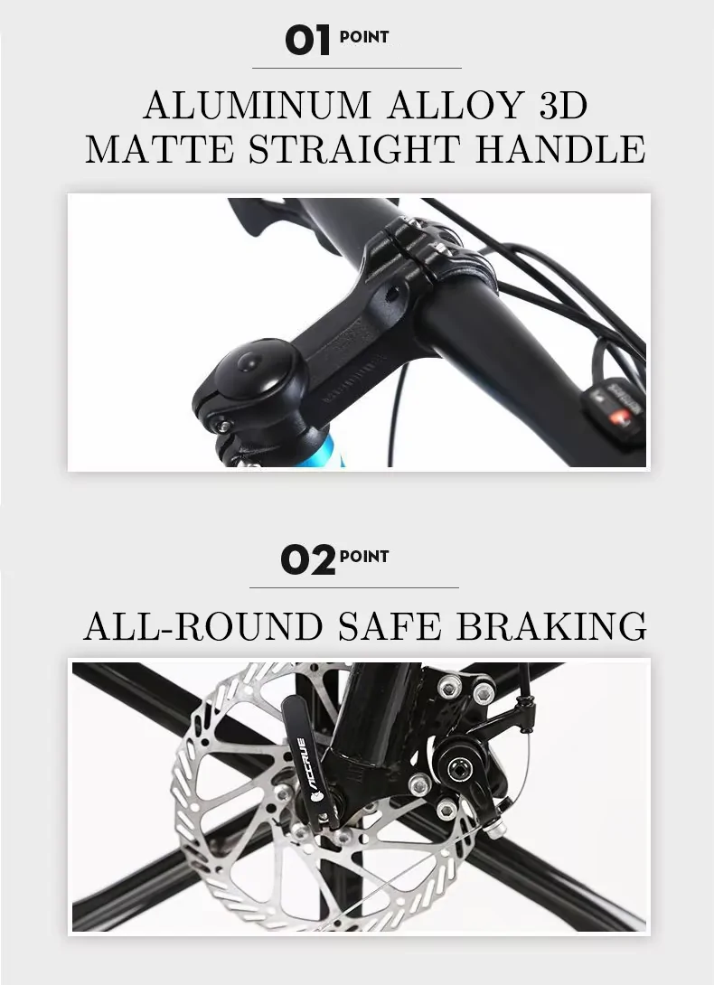 Equipped with a suspension fork, this bike ensures a smooth and comfortable ride, even on rough, uneven terrain. The suspension fork absorbs shocks and bumps, reducing the strain on your body and allowing you to maintain better control over the bike. Whether you're tackling snowy trails, rocky paths, or forested roads, this feature enhances stability and comfort, making it easier to conquer challenging environments.